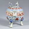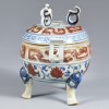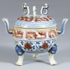 This incense burner was produced during the Xuande reign of the Ming dynasty (1426–1435). The lid is fitted with three loops and pierced with holes for the release of incense smoke. Handles are attached to either side of the vessel, and the base rests on three animal-shaped legs, forming a tripod structure. Such a form is thought to have been inspired by ritual bronzes from the Bronze Age. As a vessel for burning incense, it was mainly used in ancestral rites, court ceremonies, or in the refined living quarters of the elite. The elaborate and ornate decoration suggests that this piece was intended for use by the upper classes.