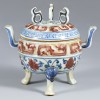 通体施青花与釉里红,色彩绚丽而富于生动感。炉盖环饰青花雷纹,器身中央以釉里红绘龙纹,其形态与雷纹呼应。下部则以青花与釉里红相间描绘宝相花与缠枝纹,纹饰细腻繁复。三兽足以青花为饰,炉底署“宣德年制”款识,可知其为宣德时期青花瓷的代表性佳作。