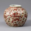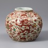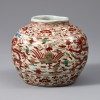 명나라 만력 연간(1573~1620)에 제작된 용봉문(龍鳳紋) 오채(五彩) 항아리입니다. 짧고 두꺼운 구연부와 둥글게 팽창한 몸체, 안정된 저부를 지녔습니다. 표면에는 수직 방향으로 반복된 골이 형성되어 기면에 입체감이 느껴집니다. 전면에는 백유를 두껍게 시유한 뒤 적색, 녹색, 황색 세 가지 안료를 사용한 오채 기법으로 문양을 그렸습니다.