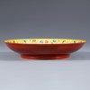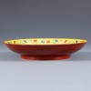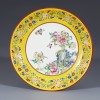 청나라 옹정 연간에 제작된 궁중 도자입니다. 황지(黃地) 바탕을 칠하고, 분채(粉彩)로 모란문(牡丹紋)을 화려하게 시문한 반입니다. 굽바닥에 ‘大清雍正年製(대청옹정년제)’ 관지가 있어 옹정제 시기에 제작되었음을 알 수 있습니다.