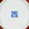 器物口沿内侧以黄色为底,其上带状环饰缠枝花卉纹,施蓝、红、绿等多种色彩。内底中央在白地上绘有怪石、牡丹与蝴蝶纹样。盛开的牡丹花铺陈饱满,花瓣与叶脉刻画细腻。器外壁无纹饰,通体均匀施以红色釉。