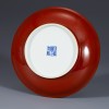 내면의 구연부에는 황색 바탕 위에 화훼당초문(花卉唐草紋)을 띠처럼 둘렀고, 청색·적색·녹색 등 다양한 색채를 사용하였습니다. 내저면 중앙에는 백색 바탕 위에 괴석과 모란, 나비를 시문하였습니다. 만개한 모란꽃이 풍성하게 채워져 있으며, 꽃잎과 잎맥이 세밀하게 묘사되어 있습니다. 외면은 문양 없이 적색 유약을 고르게 시유하였습니다.