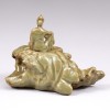 This is a Yuan-dynasty Longquan ware ceramic figure depicting Avalokiteshvara seated on a scholar’s rock. The figure wears a crown adorned with a small transformed Buddha. The head is slightly inclined, with the gaze directed downward. The right knee is raised with the right arm resting on it, while the left hand is placed behind on the ground. This posture is known as the “royal ease pose,” derived from the seated posture of a cakravartin. The drapery and ornaments are rendered in fine low relief.