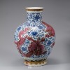 红色阳刻龙纹的青花胭脂红彩龙纹罐。口沿部外撇,短颈,阔肩,形态丰满,底足。