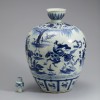 명나라 영락제 시기에 제작된 청화백자 항아리입니다. 구연부에는 주구(注口) 형태의 굴곡을 만들어 액체를 따르기 편하도록 하였습니다. 마개가 있어 액체를 보관하기 용이하며, 식초 등을 담은 것으로 추정됩니다. 어깨는 크게 부풀어졌다가 굽으로 갈수록 점차 좁아지는 기형입니다.