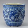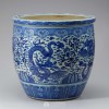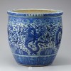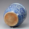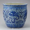 该卷缸用钴蓝色绘长有鳍的巨龙和云。口沿部较宽,撇口,圆鼓腹,肩下渐收至底,平底。