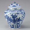 The blue-and-white porcelain jar has a glamorous body rising from a wide foot to a broad shoulder and mouth.