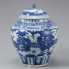 这是有盖,口沿部和足较大,肩部宽阔的器型上用钴蓝颜料绘制了古代传说故事种的人物们的青花白瓷罐。