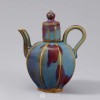 균요 특유의 하얀빛이 감도는 푸른색 바탕에 홍색 반점이 있으며 출수구, 손잡이와 같이 돌출된 부위는 황녹색의 색감을 띠고 있습니다.