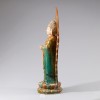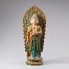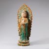 A sancai-glazed made in the Tang Dynasty. (618-907). The Buddha figurine is gorgeously painted with green, brown, and yellow on the molded body of various soils.