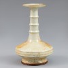 瓶体局部带有冰裂纹,釉面略显粗糙。瓶口外撇,呈平坦宽阔的碟状;细长的颈部饰有凸起的线条,仿若竹节。肩部逐渐展开,至腹部呈扁圆形,腹部侧面以起伏的曲线表现立体感。下腹部微内收,至底足外撇。此件作品属于北宋时期的稀有器物,保留了当时作为随葬品的痕迹,并且在形态及各方面展现其珍贵性。