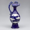 This ewer, fully coated with a deep blue glaze, features a delicately incised lotus motif on its bulbous body. The form exhibits a harmonious balance with its wide flaring mouth, slender neck, rounded belly, and high trapezoidal foot, creating a sense of stability and elegance. The lid is shaped like a phoenix's head, vividly capturing the mythical bird’s prominent crest and upward-curving beak, which exudes dynamism and vitality.