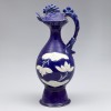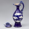 执壶通体施蓝釉,腹部阴刻莲纹。宽口沿、束颈、鼓腹以及梯形高足,使整体器型更显端庄稳重。壶盖为凤首形状,其冠羽高耸,喙向上翘。