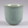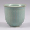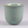 The entire cup is coated with a translucent celadon glaze. The glaze has a soft, matte texture, distinguishing it from more glossy finishes.
