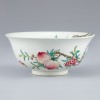 This porcelain bowl from the Qing Dynasty is decorated in the famille rose technique, featuring a meticulously painted peach tree set against a white-glazed ground.