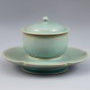 This artwork, produced at the Ru kilns during the Northern Song dynasty (960–1127), consists of a lidded cup paired with a flower-petal-shaped saucer. It is presumed to have been used for holding tea or wine. The piece embodies the refined elegance characteristic of Ru ware, showcasing its serene hues, precise form, and fine surface crackles.