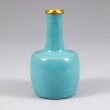This vase is a ceramic piece produced at the Ru kiln, one of the five great kilns of the Northern Song Dynasty (960–1127). Due to its form—featuring a narrow, elongated neck, sharply angled shoulders, and a stable flat base—it resembles a paper mallet and is thus called a zhichui ping (紙槌瓶), or “paper mallet vase.” The rim is overlaid with gold, referred to as jinkou (金口, “gold mouth”). Vessels with such gold rims are believed to have been used by royalty or aristocrats.
