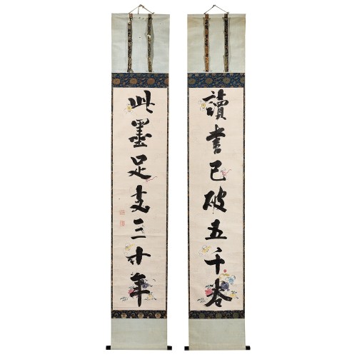 作品为两幅成对的对联形式,可与清代著名诗人袁枚(1716–1797年)亲笔书写并悬挂于其书斋中的对联相媲美。
