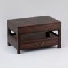 整体分为三层结构:上层为带盖的砚台收纳空间,中层为空置的开放格,下层则设有抽屉,整体设计兼具实用性与结构美感。