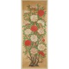 화면 전체를 가득 메운 모란 나무에는 정면과 측면에서 피어난 만개한 꽃과 봉오리가 조화롭게 배치되어 있습니다. 백색, 홍색, 담홍색 등 다양한 색조의 꽃들이 반복되어 리듬감을 줍니다. 가지는 굵고 역동적으로 휘어지며, 엽맥(葉脈)이 선명한 잎들과 함께 모란의 생명력을 강조합니다.