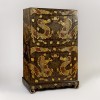 柜面以深色漆为底,装饰有围绕如意珠飞腾的四爪龙,象征权威与吉祥。背景则密布云纹与多种吉祥图案,图案繁复华丽。装饰材料采用螺钿与玳瑁,玳瑁在当时属稀有贵重材料,仅上级阶层才能享用,进一步显示此柜的尊贵属性。柜门中央镶嵌蝴蝶形铜饰,且镂空雕有“卍”字纹样。
