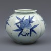 구연과 굽의 지름이 비슷한 소형 항아리입니다. 구연은 짧게 직립하고 중앙에서 최대 복경을 이루며 전체적으로 팽만한 형태입니다. 동체의 사방에 세로줄의 골이 있어 모양새가 감과 같아 감항아리라고도 부릅니다. 각 세로줄 사이로 자손 번창과 다산을 기원하는 문양인 석류를 탐스럽게 청화 안료로 시문하였습니다. 구연부 둘레에는 청화로 한 줄의 띠를 돌렸습니다. 굽바닥에는 모래 받침 흔적이 남아있습니다.