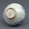 This small jar has nearly the same diameter at the mouth and base. The mouth stands upright, the body swells broadly at the midsection, and the overall form is rounded. Vertical flutes divide the body into sections, giving the jar the appearance of a persimmon, hence the nickname “persimmon jar.” Between the flutes, lush pomegranates—symbols of fertility and abundant offspring—are painted in cobalt blue. A band encircles the mouth rim, also painted in blue.