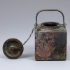 This bronze square kettle is presumed to have been crafted during the late Joseon period. It features a nearly cubic body topped with a flat lid, which is secured to the body by a chain to prevent loss. A spout is located at one corner of the body. Constructed from bronze to ensure durability, the surface bears traces of corrosion resulting from the passage of time.
