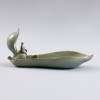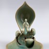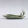 This incense holder is shaped like a lotus petal resembling a small boat with a sail. At the end of the leaf sits a lotus seed pod, and on top of it is a small figurine, giving the impression of a boat floating on water. In the center of the seed pod, there is a hole designed to hold incense. In Buddhism, the lotus symbolizes purity and enlightenment, and because it simultaneously bears both flowers and seeds, it also represents vitality and abundance. The combination of the lotus, the act of burning incense, and the small monk-like figurine reflects a Buddhist worldview.