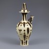 This ewer has a narrow, elongated neck topped with a disc-shaped collar and a spout for pouring water. The jingping (净甁) was one of the ritual vessels used in Buddhism, designed to hold ambrosial water (ganlu shui) or pure water. Its form swells at the shoulders before tapering downwards, and attached to the shoulder is a spout in the shape of a dragon’s head. The base is flat, and on its underside is an imperial mark reading gongyu (供御, “for imperial use”), indicating that this piece was produced for the emperor.