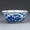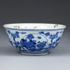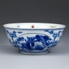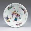 瓷碗内壁以粉彩绘制书架图,外壁以青花描绘自然风景。口沿外撇,腹部线条柔和,短圈足,端庄稳重。