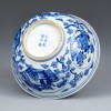 碗的外壁以青花颜料在开光内描绘山水景物与花卉纹样。画中山水、亭台与花卉描绘精致,既呈现了理想化的自然风景,又蕴含富贵吉祥的寓意。青花发色清透深沉,笔触精炼细腻,充分体现了乾隆时期官窑瓷器的典型特征。