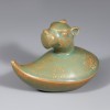 通体施以汝窑特有的淡雅天青釉,釉面柔和而富有微光。局部可见细密的开片及釉层厚薄的自然变化,呈现出温润的质感。器表略带黄褐色的土沁,应为长时期埋藏所致,由此推测其作为随葬明器,与实际使用的砚滴无关。器底内侧可见三处以石英支钉支烧的痕迹。