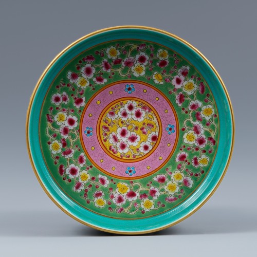 This imperial porcelain was produced at the Imperial Kiln during the reign of the Qianlong Emperor (1735–1796) of the Qing Dynasty. It takes the form of a dish with a wide rim and a shallow body. The base bears the inscription ‘Qianlong Yuzhi (乾隆御製).’ This inscription indicates that the piece was commissioned, produced, and used by the Imperial court under the order of the Qianlong Emperor.