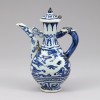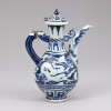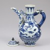 This blue and white porcelain ewer features a dragon and cloud design and dates from the late Yuan to the early Ming dynasty. The vessel has a flared mouth, a constricted neck, and a voluminous body, supported by a short, spreading foot that provides a stable form. The spout and handle are modeled after a dragon's head. The spout is crafted to look as if water flows from the dragon's mouth, while the handle resembles a dragon biting the vessel, creating a dynamic impression. The lid is topped with a bud-shaped finial and attached with a small loop, which appears to have been used to secure the lid to the ewer with a cord to prevent loss.
