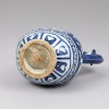원말명초에 제작된 청화백자 운룡문 용수 주자입니다. 구연이 벌어지고 목이 잘록하게 들어간 뒤 몸체는 풍만하며, 굽은 짧게 벌어진 안정적인 형태입니다. 주구와 손잡이는 용의 머리를 본떠 조형하였습니다. 주구는 용의 입에서 물이 흘러나오는 듯한 모습으로 표현되었습니다. 손잡이 또한 용이 물고 있는 듯한 형상으로 역동적인 인상을 더합니다. 뚜껑에는 꽃봉오리 모양의 꼭지를 세우고 작은 고리를 부착하였습니다. 이 고리는 끈 등을 주자에 연결해 뚜껑의 유실을 방지하기 위한 용도로 보입니다.