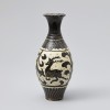 The mouth is trumpet-shaped and flares outward, with a lip modified to resemble flower petals. Below the slender neck, the body forms a round and elongated shape. The black-flower technique was used, in which the clay body was coated with white glaze and then painted with designs using black pigment. During the firing process, kiln transmutation occurred due to the kiln atmosphere, resulting in natural irregularities on the surface.