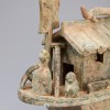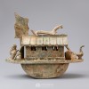This green-glazed boat was made during the Han Dynasty (202 BCE–220 CE). The boat features a large, tile-roofed building, symbolizing an imperial palace, standing majestically on its deck. A dragon, representing the ruling family that first unified China and safeguarded the nation, is seen coiling towards the sky atop the roof. Three window openings in the walls allow a view of the external world, depicting a symbolic perspective of the male-dominated society at the time. Green-glazed vessels featuring figures peering out of windows are rare.