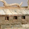 这是一艘汉代(公元前202年~公元220年)制作的绿釉陶船。船上巍然矗立着象征皇宫的瓦屋,呈现出宏伟壮丽的姿态。屋顶上雕刻着守护最早统一中国的皇室与国家的龙,腾空而起,气势磅礴。船壁上开有三扇窗,透过窗户,可以看到人物雕像仿佛在眺望外面的世界。雕刻有眺望窗外人物的绿釉陶船极为罕见。