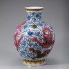 该罐白色基面上阳刻正在龙纹,作张牙舞爪状,其上施红釉,造型特殊,制作精美。