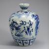 At the center of the body, a scene depicting three generals in combat, known as the Three Famous Generals motif, is painted in deep cobalt blue. Each general is shown mounted on horseback, dynamically pursuing one another. The figures represent Liu Wuzhou of Dingyang, Wang Shichong of Luoyang, and Li Yuan of Taiyuan, historical figures who appeared during the late Sui dynasty (581–619). Banana-leaf motifs decorate the rim, while the shoulder is adorned with baoxianghua (precious floral) designs.