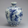 몸체 중앙에는 발색이 짙은 청화로 세 명의 장수가 전투하는 장면인 삼명장문(三名將紋)이 시문되었습니다. 세 장수가 각각 말을 타고 서로 쫓고 쫓기는 모습을 역동적으로 묘사하였습니다. 세 장수는 정양(定陽)의 유무주(劉武周), 낙양(洛陽)의 왕세충(王世充), 태원(太原)의 이연(李淵)을 가리킵니다. 이들은 수나라(隋, 581~619) 말기에 등장하였던 인물들입니다. 구연부에는 파초 문양이, 어깨에는 보상화(寶相花) 문양이 그려져 있습니다.