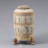 圆柱形器身由褐色彩绘形似老虎形状的3条腿支撑,上有褐色圆纹的盖子。