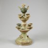맨 위에는 정교하게 조각된 봉황의 등 위에 등잔이 하나 놓여 있고, 그 아래 두 개의 원형 위에 각각 네 개의 작은 원형의 등잔이 놓여 있어 총 아홉 개의 등잔으로 구성되어 있습니다. 봉황 모양의 등잔과 그 아래 네 개의 등잔이 함께 구성되어 있는 상단과, 대나무 모양을 닮은 기둥에 네 개의 등잔이 붙어 있는 중단, 받침대가 있는 하단으로 삼등분하여 분리가 가능하며, 녹색의 유약이 비교적 많이 남아 있어 상태가 양호함을 알 수 있습니다. 상단에 봉황 모양이 있으며 봉황의 털 표현 등이 매우 섬세하고 정교하게 제작되어 있어 황제나 황족의 고분에서 출토된 부장품으로 추정됩니다.