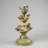 On the top is a delicately carved phoenix with a lamp on its back, and four small round lamps on each of the lower two circles, composed of nine lamps in total. It can be divided into the upper end composed of the phoenix-shaped lamp and the four lower lamps, the middle end of the four lamps attached to the bamboo-shaped pillar, and the lower end with the base. The amount of green glaze proves that the condition of the present work is good. The upper end has the phoenix figurine, and the exquisitely depicted fur of the phoenix implies that it was made to be a burial good for the tomb of an emperor or nobleman.