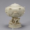 该香炉制造于北宋定窑,大口沿部和底部,其上有像是把花倒放形状的盖。