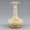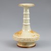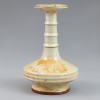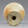 瓶体局部带有冰裂纹,釉面略显粗糙。瓶口外撇,呈平坦宽阔的碟状;细长的颈部饰有凸起的线条,仿若竹节。肩部逐渐展开,至腹部呈扁圆形,腹部侧面以起伏的曲线表现立体感。下腹部微内收,至底足外撇。此件作品属于北宋时期的稀有器物,保留了当时作为随葬品的痕迹,并且在形态及各方面展现其珍贵性。