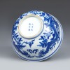 내면에 투채로 초충도(草蟲圖)가 그려지고 외벽에 청화로 풍성하게 핀 장수 복숭아 사이를 날아다니는 두 마리의 용이 그려진 완입니다.