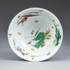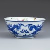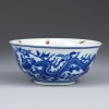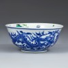 碗内以斗彩绘草虫图,外壁以青花绘两条在繁茂盛开的寿桃间飞舞的龙。