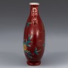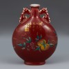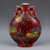 抱月瓶以红釉为底,其上绘象征长寿的桃树和寓意吉祥的蝙蝠。